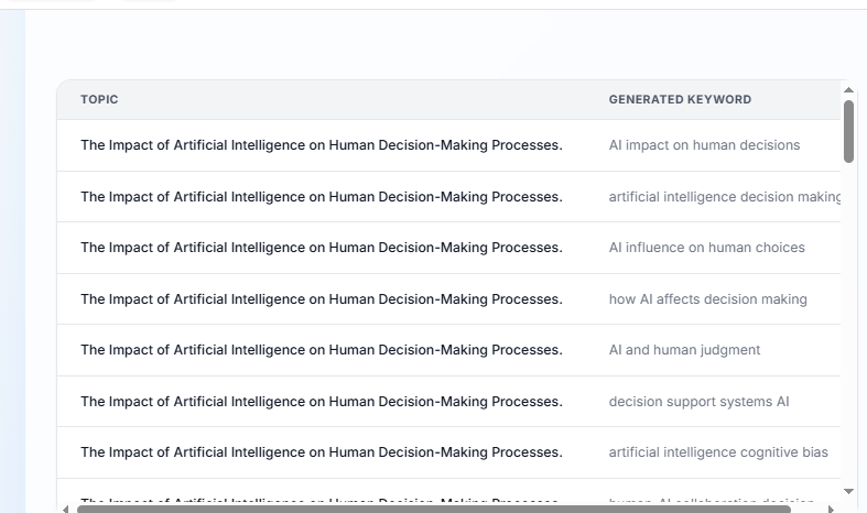 I created a custom prompt process that refines results through multiple iterations, so the generated keywords actually sound natural and match real user behavior. Every topic you upload gets keyword variations that you can directly use to optimize your content, without extra filtering or guesswork.